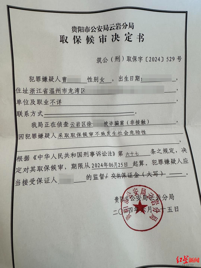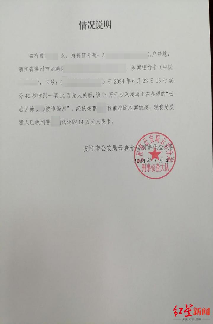 ▲6月25日,贵阳市公安局云岩分局对曹女士变更为取保候审7月4日,贵阳市公安局云岩分局刑事侦查大队出具了排除曹女士涉案嫌疑的“情况说明”。说明称,曹女士的涉案银行卡于6月23日15时46分49秒收到一笔14万元人民币,该14万元涉及该局正在办理的“云岩区徐某某被诈骗案”,经核查曹女士目前排除涉案嫌疑,现该局受害人已收到曹女士退还的14万元。曹女士称,9月24日,她接到贵阳警方的电话称,警方已邮寄她被解除取保候审的相关文书,但其至今未收到。