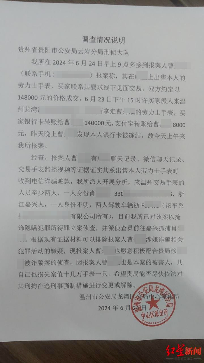 温州市公安局龙湾区分局中心派出所向贵阳市公安局云岩分局刑侦大队出具的“调查情况说明”显示,“根据现有证据材料可以排除报案人曹女士涉嫌诈骗相关犯罪活动的嫌疑,现报案人曹女士也愿意积极配合贵局徐某某被诈骗案的侦查,因报案人曹女士也是本案的被害人,自己也损失案值十几万手表一只,希望贵局能否尽快依法对其刑拘在逃刑事强制措施进行变更或解除。”