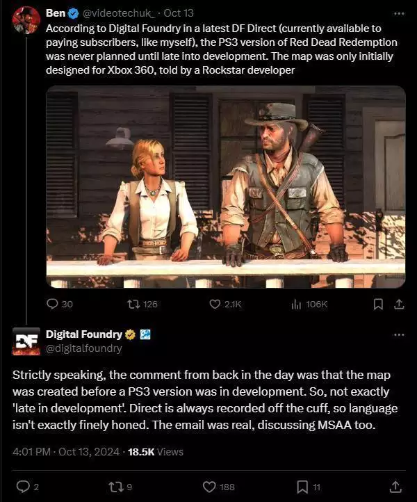 在观看过视频后,推特用户“Ben”透露在视频中数毛社表示,直到《荒野大镖客:救赎》的开发后期,PS3版本才被列入计划中。而Rockstar的一位员工透露,游戏最初的地图,都是为Xbox 360主机设计的。