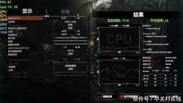 《古墓丽影:暗影》在1080p分辨率下受CPU影响也比较显著,所以1080p高画质下平均帧数为48fps,帧数基本与上一代持平。但别忘了酷睿Ultra 7 200V功耗更低,取得这样的成绩还是相当让人满意的。