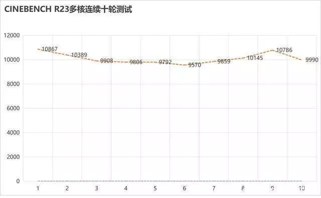 此外在测试中我们也发现,英特尔酷睿Ultra 7 258V的性能释放相对以往而言更加稳定,CINEBENCH R23多核心连续十轮测试,9900以上高分出现率达到了60%,最高分与最低分相差仅1297分,没有出现以往那种极大幅度的跑分差异。