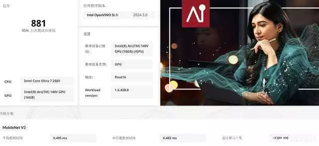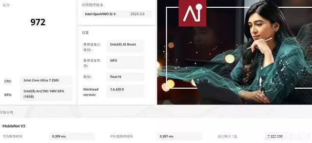 这里参考UL Procyon的NPU Float16测试以及GPU Float16测试。在Intel OpenVINO加速支持下,NPU性能达到了972分,GPU达到了881分。而上一代酷睿Ultra 9 185H在同样测试中,NPU得分为272分,GPU得分为467分,性能提升分别为260%和89%!