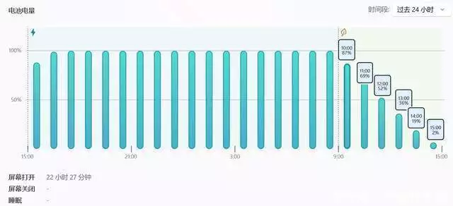 测试是从早上9点42分开始,10点整的时候电量为87%,之后每个整点通过系统电池电量监控进行电量记录,具体如下: