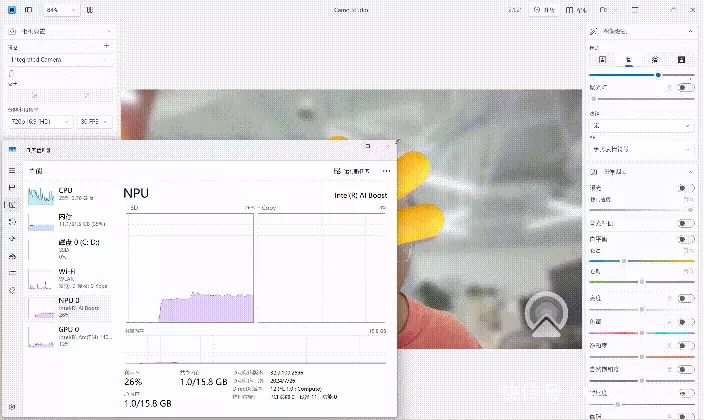 当前,NPU的应用主要体现在摄像头相关功能上。比如Camo Studio这款强大的摄像头工具,它的背景虚化,手势符号等功能都可以借助NPU来快速实现。下图是笔者体验手势符号的截图,可以看到识别和生成符号的速度都很快,尤其是酷睿Ultra 200V算力更强的NPU加持之下,明显能够感觉到速度层面的提升。