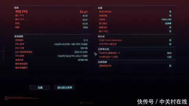 《赛博朋克2077》这种依赖GPU性能的就更不必说了,上一代锐炫核显在1080p低画质、开启XeSS的情况下只能拿到平均40fps的流畅度,而锐炫140V提升了近15fps,平均达到了54.61fps。