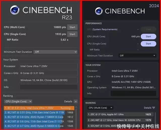 还是参考CINEBENCH R23以及2024测试标准,不插电状态下这颗处理器多核得分最高可以达到10885分和640分,这意味着插电和不插电都能让酷睿Ultra 7 258V全速运行。