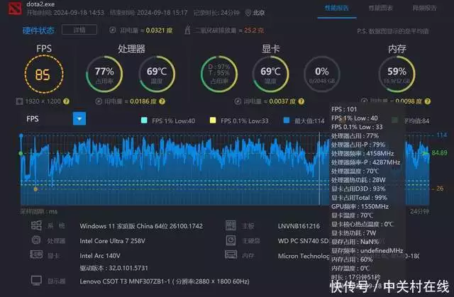 如果遇到更加依赖GPU的游戏的话,那么锐炫140V图形性能升级的效果就会凸显出来。比如《DOTA2》,1080p最高画质平均帧数达到了85fps,相比上一代平均60fps+的流畅度提升显著。
