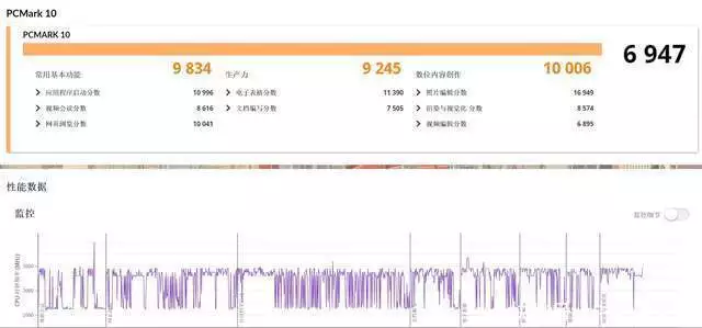 再参考PCMark 10办公模式测试,常用基本功能,包含Web浏览、视频会议、应用程序启动等得分为9834分,说明其完成这些基础办公任务没有任何问题;生产力项目测试中得分高达9245分,表明其拥有卓越的电子表格、文档工作性能;数位内容创作评分高达10006分,说明其能够非常高效地完成图片、视频编辑、图形渲染等工作;综合得分6947。低于上代90W的酷睿Ultra 9 185H平台(7790分),略低于锐龙AI 9 HX 370平台(7132分)。