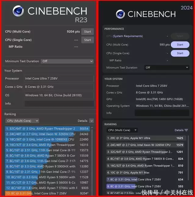 其一,由于核心数下降,并且砍掉了超线程,酷睿Ultra 7 258V的多核心跑分成绩不及上代同级别处理器,也不及锐龙平台。