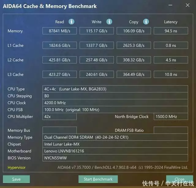 自笔记本电脑全面升级DDR5内存之后,内存延迟就普遍超过了110ns。英特尔酷睿Ultra 200V采用了片上集成式的内存设计,所以对于降低延迟来说效果拔群。酷睿Ultra 7 258V搭载了32GB LPDDR5X内存,AIDA 64实测延迟仅为94.5ns。其读取速度为87841MB/s,写入速度达到115.71GB/s,拷贝速度达到106.09GB/s,内存性能相当出色。