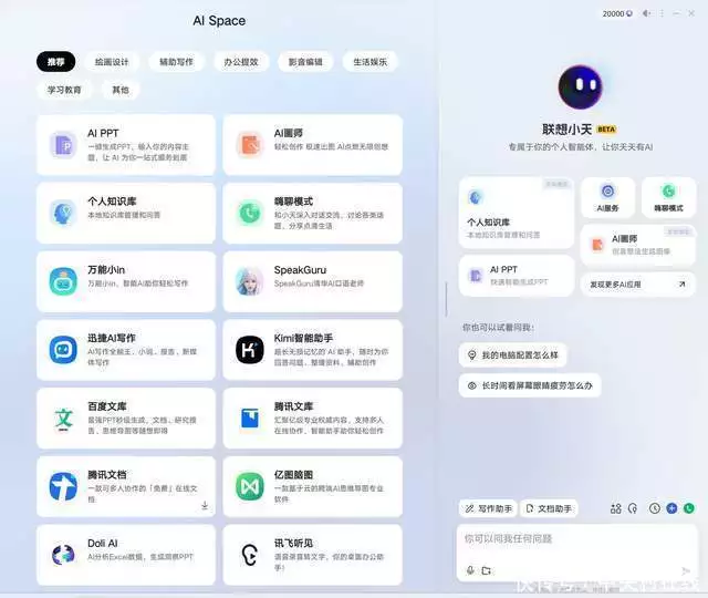 首先是联想自主研发的联想小天AI助手,它可以说是一个功能强大的AI应用整合界面,包含了当下常用的各种AI功能,如个人知识库、Chatbot、AI绘图、AI PPT生成等等。