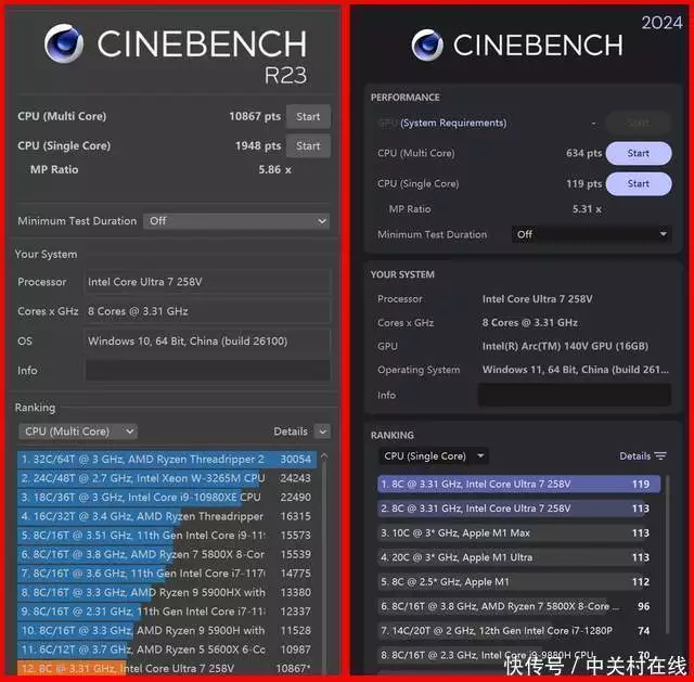 参考CINEBENCH R23以及2024测试标准,这颗处理器R23单核得分1948分,多核得分10867分;2024单核得分119分,多核得分634分。在核心和超线程被砍掉大半的情况下,单核得分超越上一代同级别处理器,多核得分强于预期。