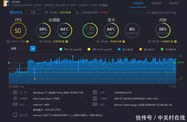 总体来说,锐炫140V核显图形性能提升是符合预期的,在面对依赖GPU性能的游戏上,图形性能提升带来的优势体现的极为明显,平均高出上一代大约5-15fps;而遇到CPU影响相对比较大的游戏时,至少能够确保与上一代同等的画面流畅度,并且有的游戏还能小幅提升。同时还是别忘了,这些提升都是在更低功耗下实现的,单这一点对于轻薄本来说就是非常可观的收益。