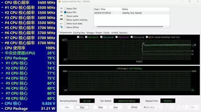 酷睿Ultra 200V的整体设计思路其实是从卷功耗、卷性能转变成了轻薄本的设计和应用需求上,所以它的最大功耗只给到了37W。联想YOGA Air 15 Aura AI元启版满载功耗给到了31W,8个核心温度在74℃到80℃之间,封装温度为79℃,对于轻薄本来说有着相当友好的散热体验。而且8个核心事实上足以满足当下绝大多数轻薄本应用的需求。