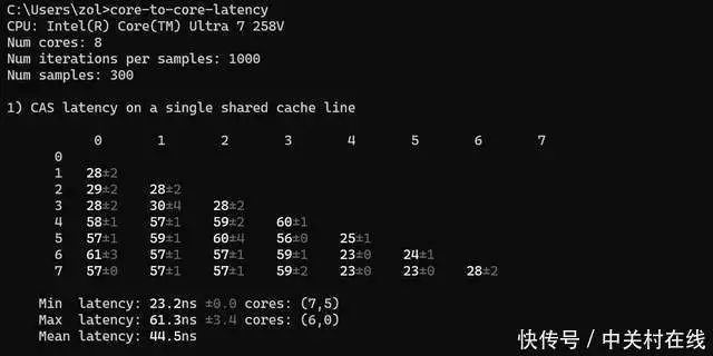 此外,英特尔在介绍酷睿Ultra 200V架构设计时,强调了它的低延迟特性。考虑到锐龙AI 9 HX 370核心间平均延迟达到了106ns,最高达到了220ns左右,我们也测试了酷睿Ultra 7 258V的核心延迟,平均为44.5ns,最大为61.3ns,虽然依旧是分离式架构设计,但酷睿Ultra 200V的核心间延迟控制显然比锐龙AI 300系列好上不少。当然,核心间延迟在实际应用中对用户而言不会有太过明显的感受,所以这部分测试结果大家看看就好了。