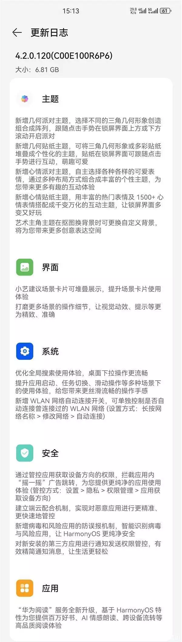 这次更新的版本号是4.2.0.120(SP1C00E100R6P6),新增了摇一摇权限管理、自动连接WLAN网络开关、以及互动主题等新功能,系统包大小大约为6.81GB。