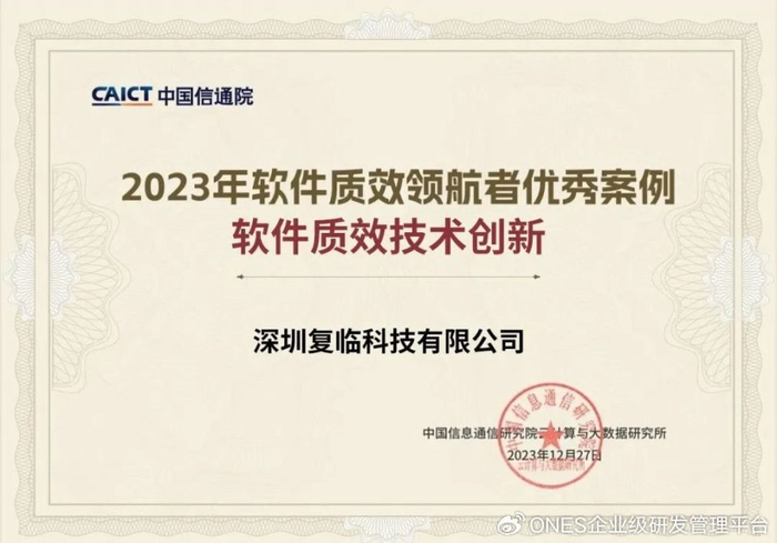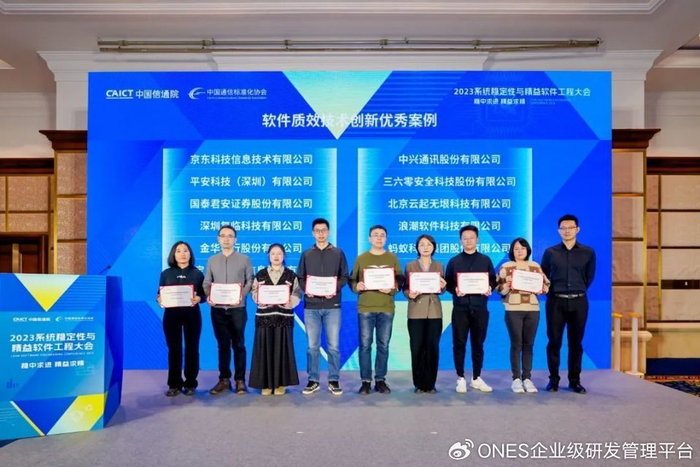 凭借产品及服务的成熟度、典范性和行业影响力,ONES 企业级研发管理解决方案脱颖而出,成功获评「软件质效技术创新」优秀案例。同时获得此奖项的,还有京东科技、中兴通讯、蚂蚁科技、浪潮软件等10家知名科技企业。