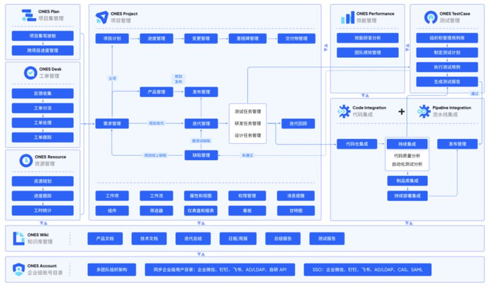 中大型研发团队规模庞大,容易出现研发数据割裂、流程不一致、跨部门协作低效、项目统筹难等问题。立足于以上痛点和中国企业的研发场景,ONES 围绕项目管理、知识库管理、测试管理、代码集成、流水线集成、效能管理、工单管理、流程自动化、项目集管理等关键业务环节,打造了覆盖全生命周期的研发管理平台。