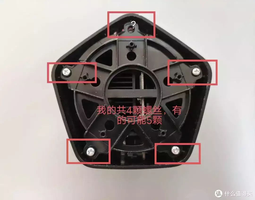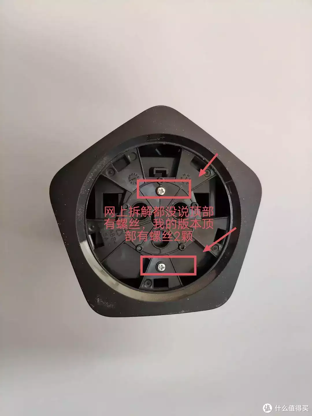我看网上拆解文章都说底部有5颗固定螺丝,但我的只有4颗,顶部那个是空的,没有螺丝孔。可能版本不同吧。把这个四五个螺丝都拆下来。