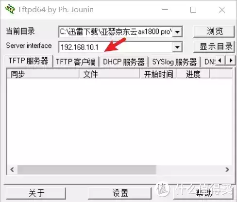 双击tftpd64.exe文件开启tftpd64软件,此时下图中红框内就是你在步骤2中设置的电脑有线网卡的IP地址。保持该软件开启即可。