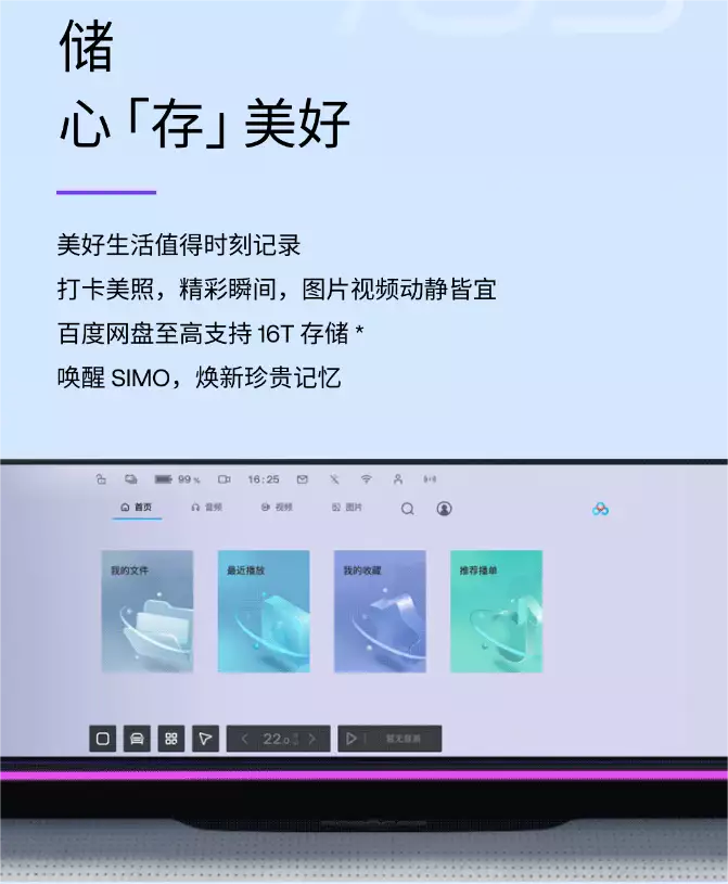 百度网盘至高支持 16T 存储,用户可通过唤醒极越汽车 SIMO 助手播放网盘内的图片视频。需要注意的是,百度网盘车载版上传、下载、分享等文件管理操作需要在移动端进行操作。