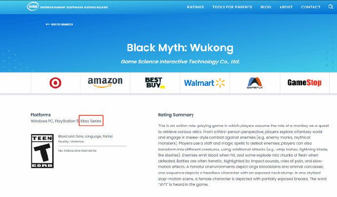 但实际上,开发商游戏科学表示由于Xbox版本品质没有达到团队内部要求标准而无法与PC、PS5同步发售。在游戏发售两个月之后,终于有了好消息,根据ESRB评级公开的信息,《黑神话:悟空》评级中已经包含Xbox Series平台。