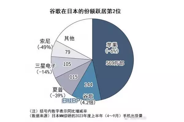 而与此同时,美国谷歌的份额却大幅增加。该公司2022年度全年的日本国内份额并未进入排行榜,但2023年度上半年的份额跃升至第2位,仅次于稳居首位的美国苹果。出货量大幅增至144万部,是上年同期的4倍多。此外,苹果手机的市场份额虽然有所下降,但也占据了接近一半的市场。