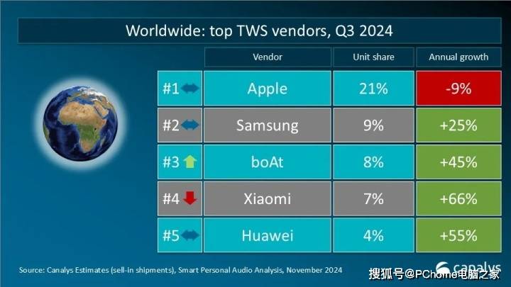 尽管全球排名第一的耳机品牌依旧是苹果,市场份额占比为21%,但却出现了9%的同比下降,也是TOP 5品牌中唯一一个出现份额下降的品牌。三星则凭借新品Galaxy Buds 3系列的强劲表现,以9%的份额位列第二。boAt位列第三,市场份额增长至8%,同比增幅达到45%。其利用印度市场的销售旺季,首次超过中国厂商冲进前三。中国厂商小米和华为,凭借其在入门级产品持续迭代迭代以及开放式产品线的布局,均保持大两位数的同比增长,分别位列第四第五。