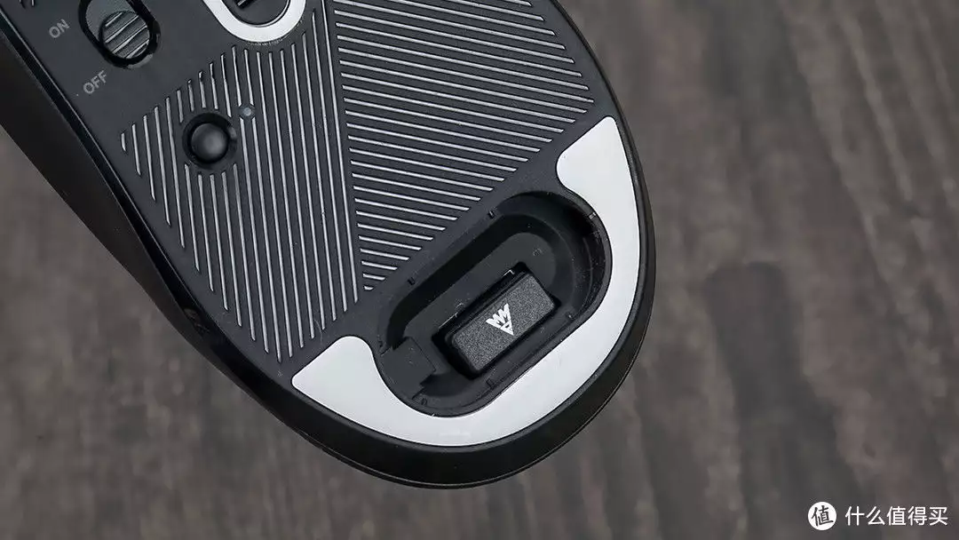 鼠标底部采用横纵纹理处理,视觉效果不错,上下提供了两条特氟龙脚贴,可以提升操控的顺滑度与稳定性。底壳布局提供了电源开关、DPI按钮以及一枚功能按钮,1K版本为模式切换键,4K版本为回报率切换键,功能考虑细节周到,使用起来也更方便。底部还提供了无线适配器的收纳仓,仓盖采用磁吸方式固定,固定牢固,取用方便。这两款鼠标传感器位置都有些偏上,对于玩家来说还是需要上手重新适应一下。机身顶部提供了USB-C接口,方便为鼠标充电或是有线状态下使用。