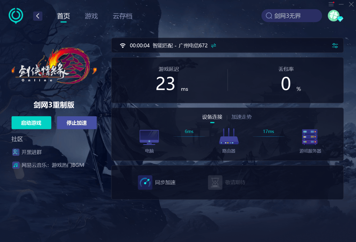 步骤2:点击优化即可获得稳定网络连接,海外也能畅玩剑网3无界