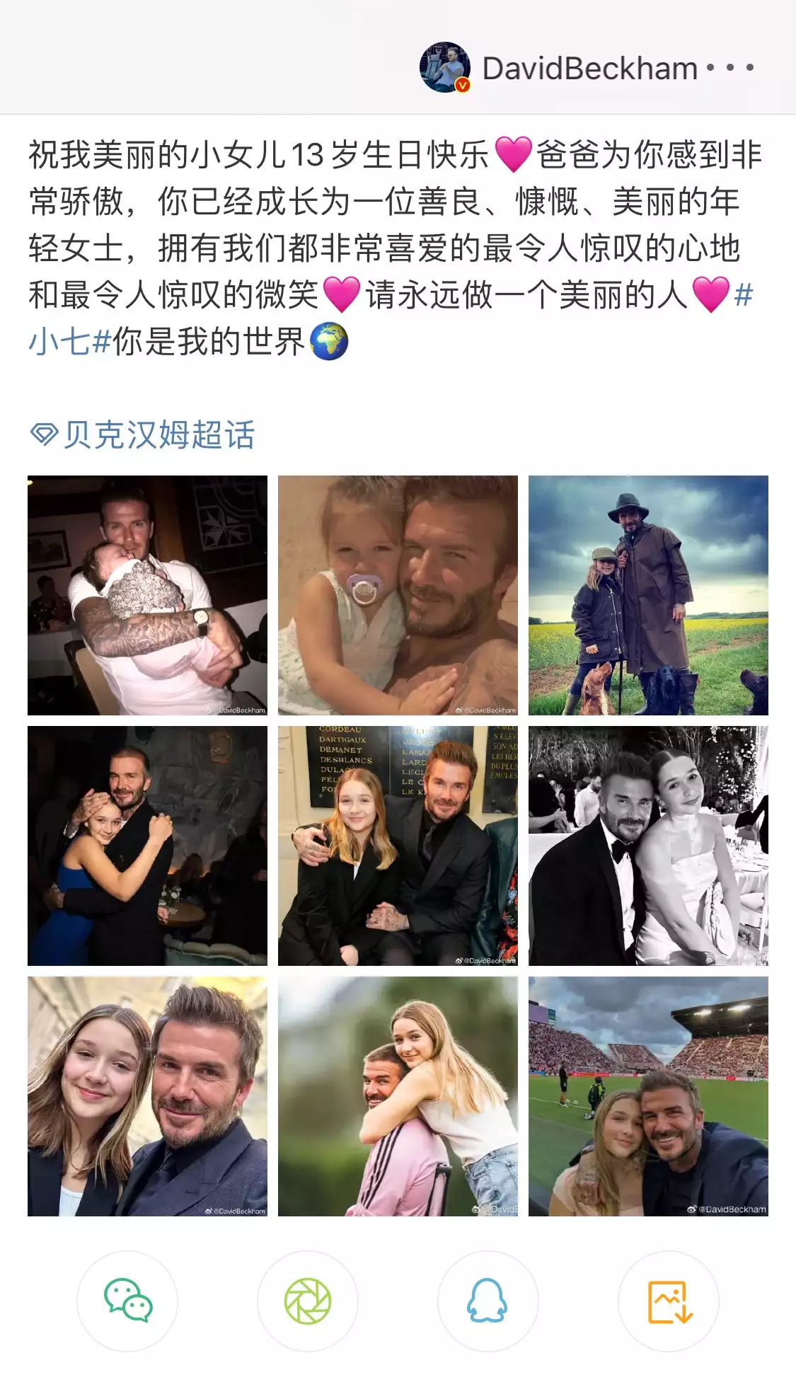 今(10)日,足坛名宿大卫·贝克汉姆在微博分享了九张与小女儿Harper Seven Beckham(小七)的合影,并中、英文对照发文庆祝女儿生日,他写道:“祝我美丽的小女儿13岁生日快乐,爸爸为你感到非常骄傲,你已经成长为一位善良、慷慨、美丽的年轻女士……小七你是我的世界。