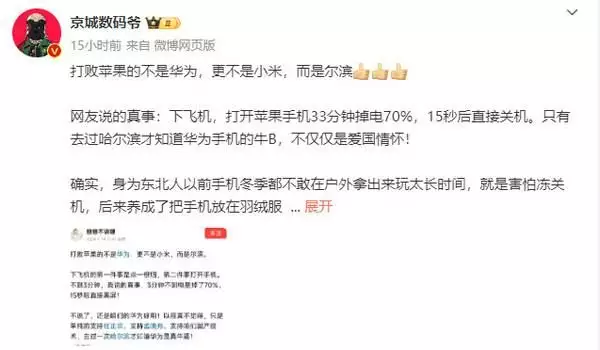 【手机中国新闻】1月17日,博主发文称:打败苹果的不是华为,更不是小米,而是尔滨。