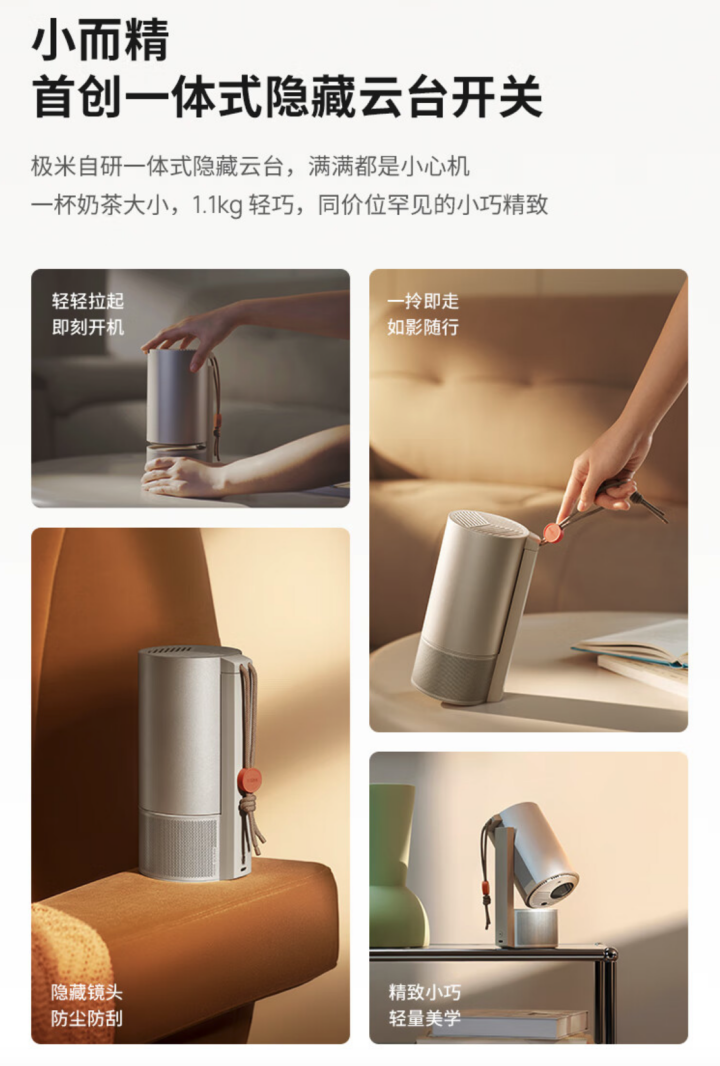 据介绍,极米 Play5 采用了极米自研的一体式隐藏云台,重 1.1Kg,号称“轻轻拉起机身就可以开机”,内置挂绳孔,号称“一拎即走”。