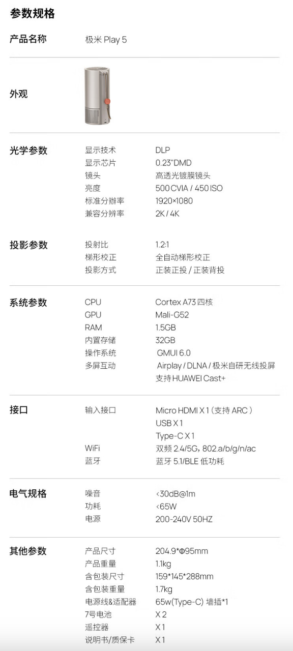 IT之家附极米 Play5 详细参数如下: