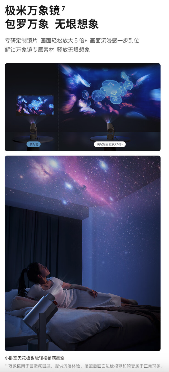 极米为 Play5 提供了丰富的配件,包含电池支架、便携收纳包、智能无线麦克风以及极米万象镜。极米万象镜采用定制镜片,能将画面放大五倍,营造氛围感。