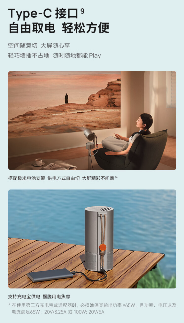 极米 Play5 使用 Type-C 接口供电,支持充电宝供电(充电宝需支持 PD 65W 及以上输出功率)。