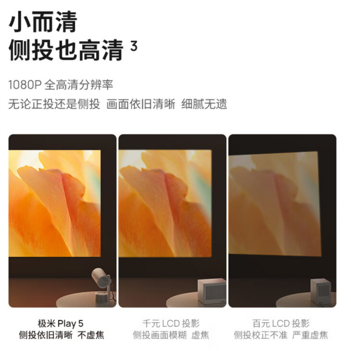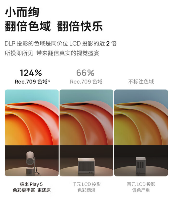 规格方面,极米 Play5 使用“高透光镀膜镜头”(具体材质未知),亮度 500 CVIA,分辨率为 1080P,覆盖 124% Rec.709 色域,支持正 / 侧投,投摄比 1.2:1。