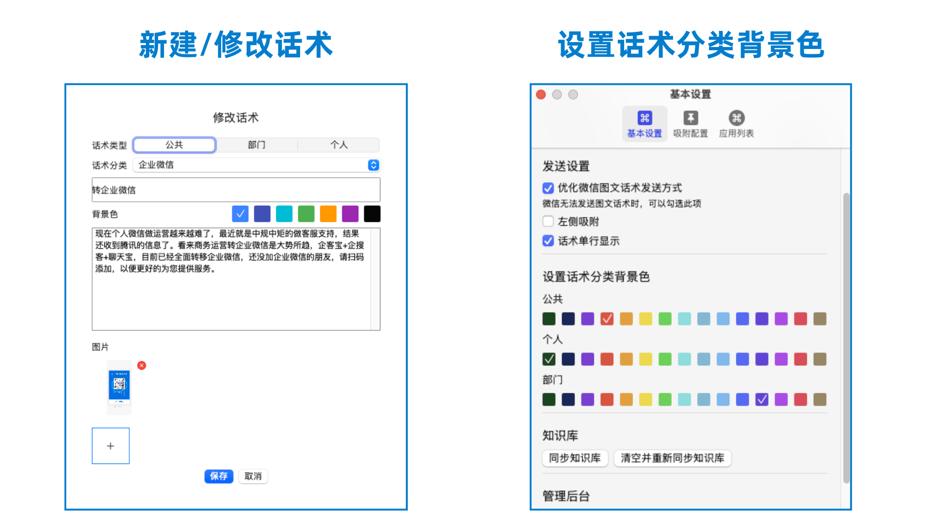 聊天宝MAC版本还支持新建修改话术,话术分类颜色设定等贴心功能,让客服用的更加满意。