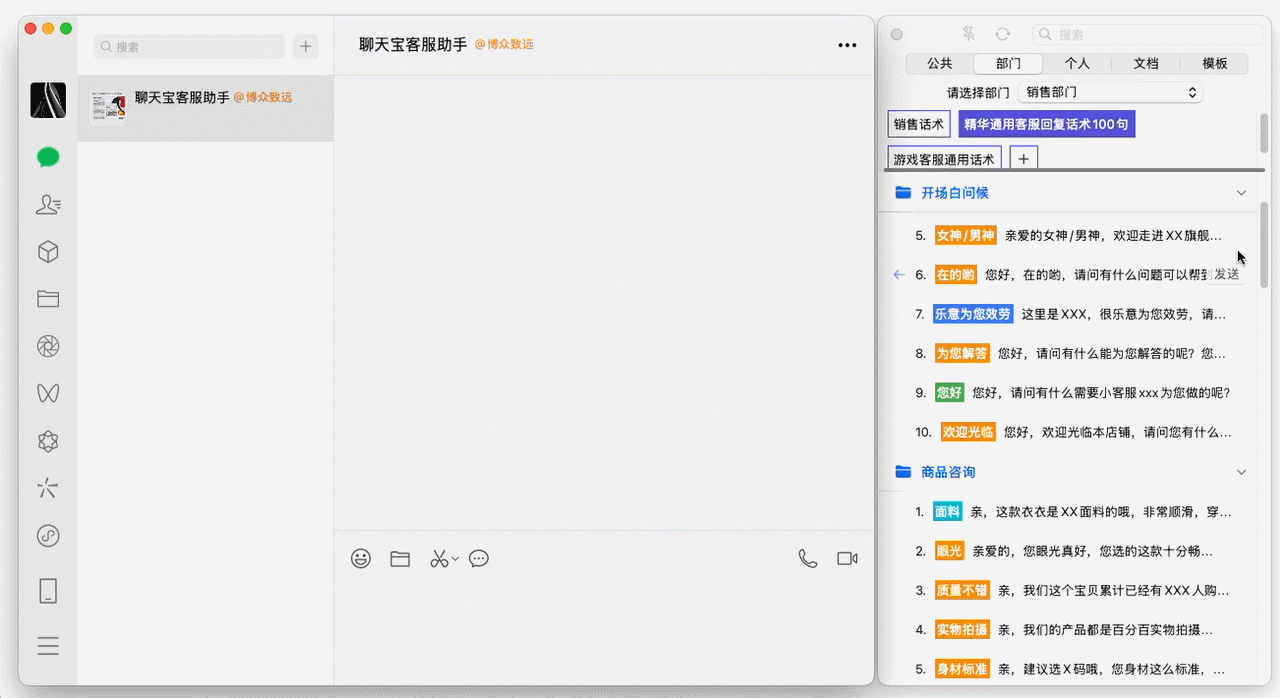 用苹果电脑做客服,最重要的需求就是图文话术的一键发送了,聊天宝MAC版能自动吸附微信,千牛,抖店,钉钉,飞书等聊天窗口,点击话术一键回复,完美解决了苹果电脑快捷回复的需求。