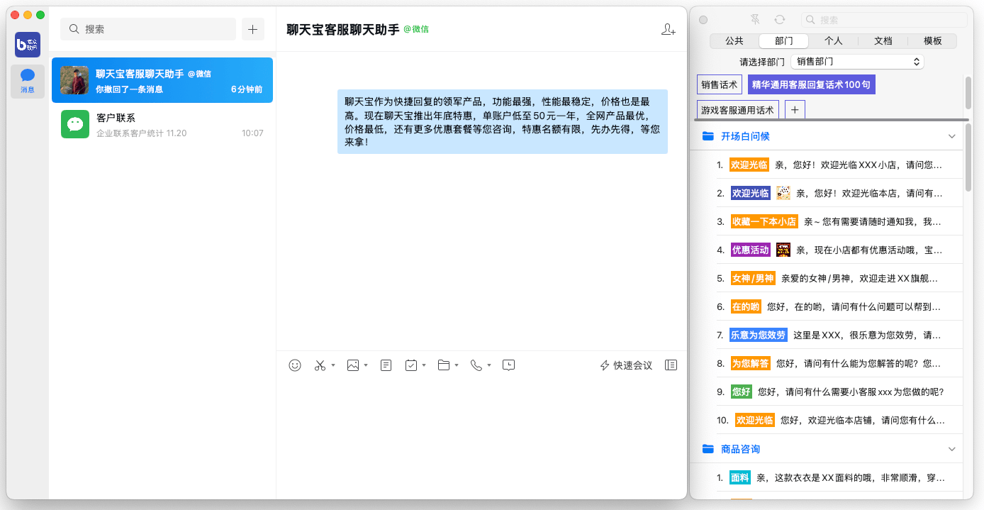很多客服用苹果电脑回复客户咨询,聊天宝MAC版能吸附常用的客服软件,点击话术一键回复,更有云文档支持文件一键发送,全面解决MAC系统快捷回复需求