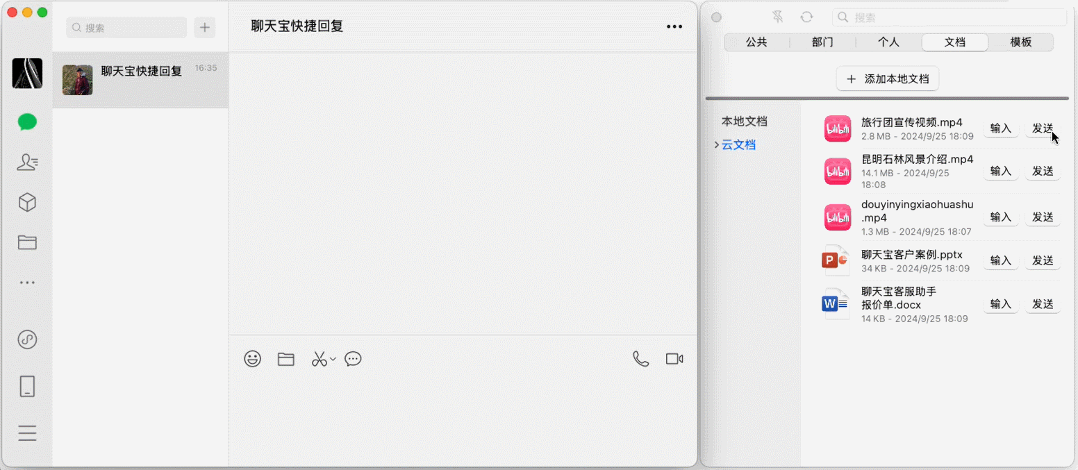聊天宝MAC版本既可以将本地文件添加到列表,也支持文件上传云端存储并实现团队共享(云文档功能)。
