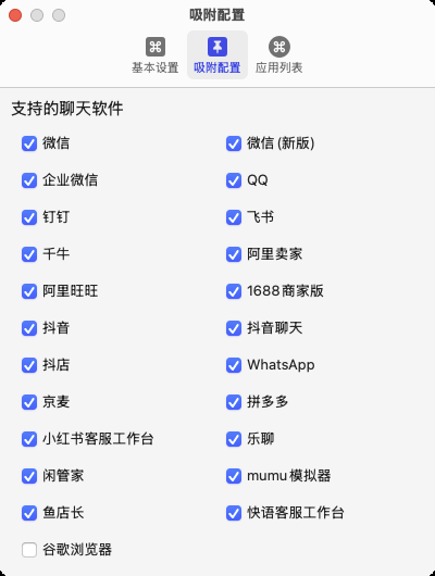 目前苹果电脑上,客服常用的聊天或电商平台,聊天宝MAC版都支持吸附一键发送,如果有些客服平台是网页登录,也可以勾选“谷歌浏览器”实现吸附和快捷发送
