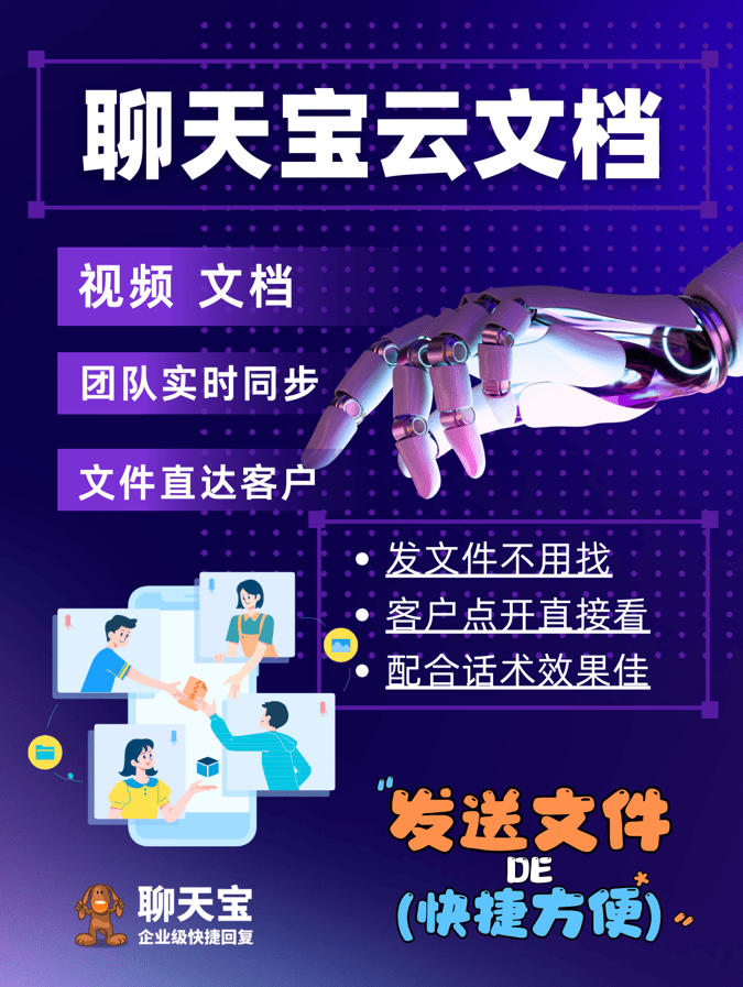 客服需要给客户发产品文案,介绍视频,报价文档等文件,在文档列表里一键点击即可发送,常用的文件格式包括PDF,word,excel,mp4视频等都支持,非常方便!