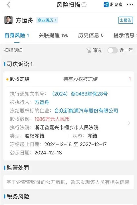 12月23日,哪吒汽车创始人方运舟新增了一项股权冻结的信息。根据相关信息,方运舟的股权在合众新能源汽车股份有限公司中被冻结,冻结数额为1986万元。此次冻结期限自2024年12月18日至2027年12月17日,执行法院是桐乡市人民法院。