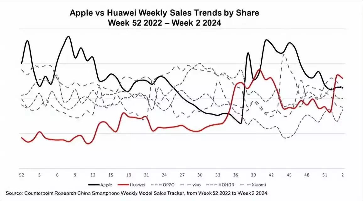 华为在2024年前两周的销量,以几乎垂直飙升的姿态,拿下了中国手机市场第一。