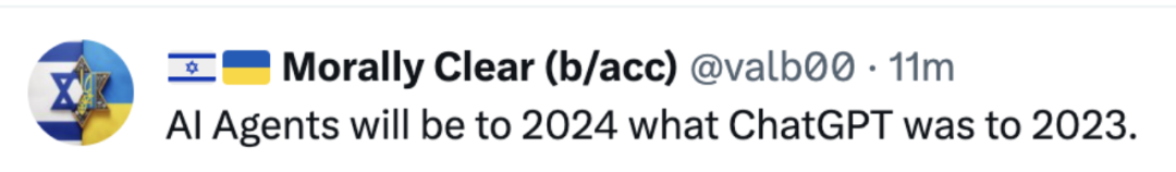 推特用户 Morally Clear 评价道:「AI 代理将会成为 2024 年的 ChatGPT。」