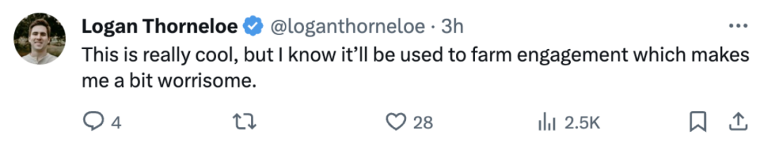 推特用户 Logan Thorneloe 评价道:“这太酷了!但是我知道它会被用来制造水军机器人,这让我有些担心。”