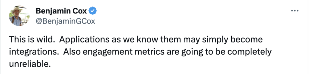 推特用户 Benjamin Cox 评价道:「这太疯狂了。我们所知的应用程序可能仅仅会变成集成。此外,机器人用户参与度指标将变得完全不可靠。」
