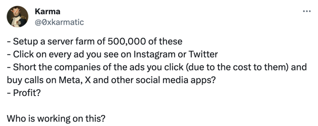 推特用户 Karma 表示了这项技术可能被用来非法牟利:“建立一个拥有 500,000 台这样的服务器农场。点击你在 Instagram 或 Twitter 上看到的每个广告。短期投资你点击的广告公司并购买 Meta、X 和其他社交媒体应用的看涨期权?利润?谁在进行这项工作?”