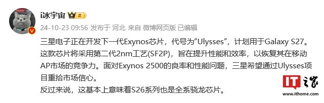 IT之家 10 月 24 日消息,消息源 @i冰宇宙 昨日(10 月 23 日)发布微博,曝料三星电子正研发下一代 Exynos 芯片,代号为“Ulysses”,计划用于 Galaxy S27 系列手机,并推测 S26 系列也是全系骁龙芯片。